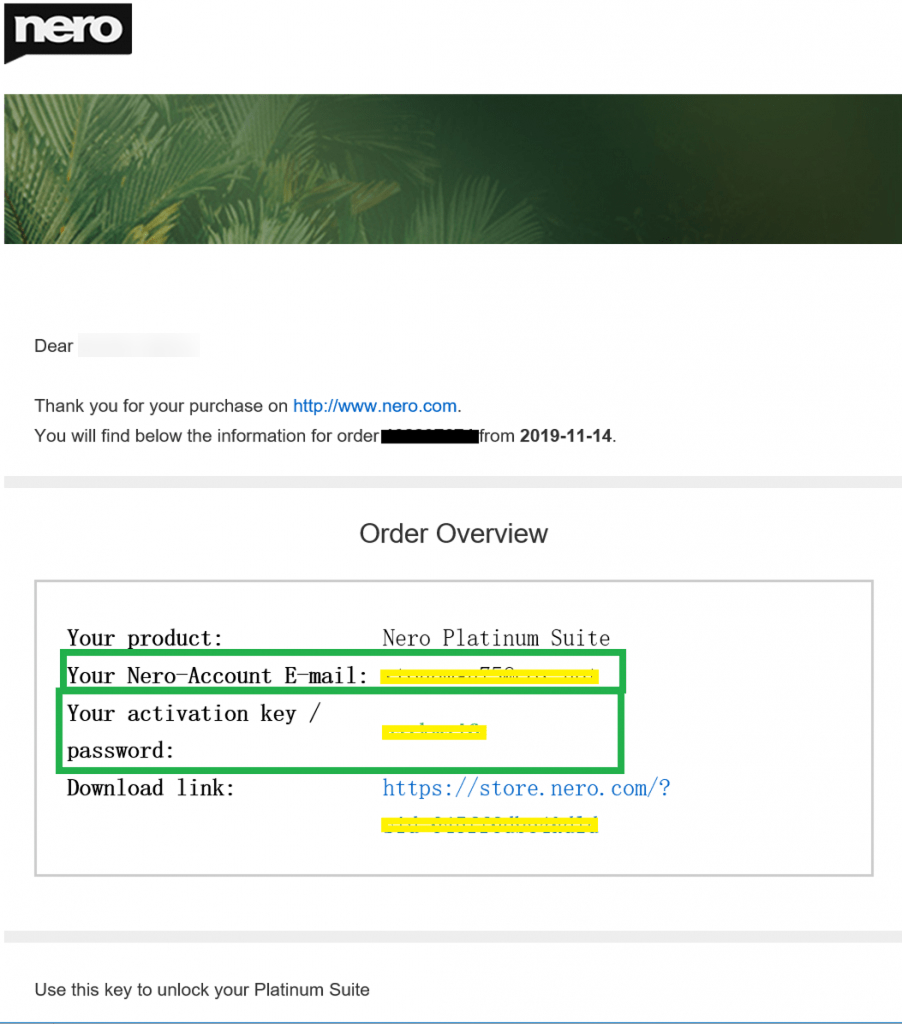 When purchasing the Platinum Suite, your Nero Account is automatically created based on the email address you entered during online purchase.