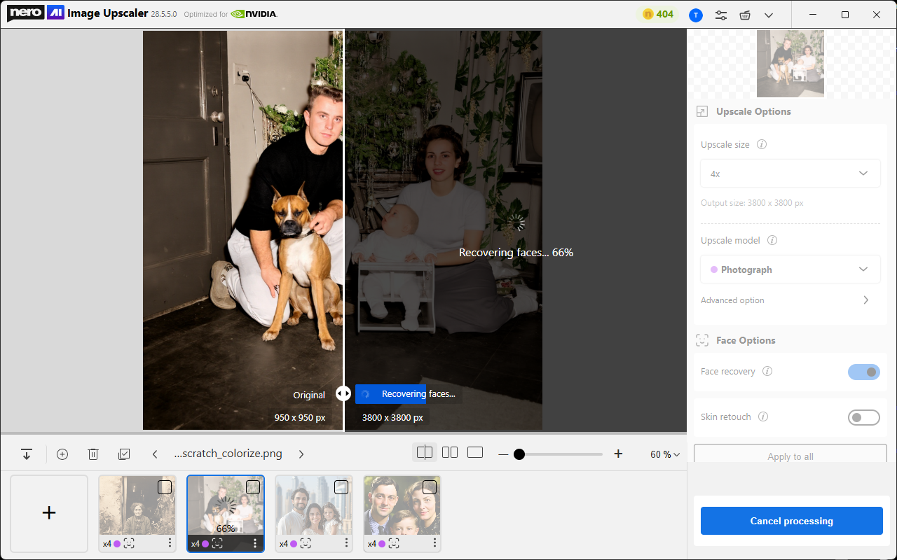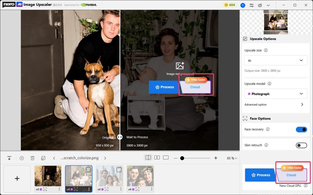 We’re pleased to announce that the latest version significantly improves processing speed through the Nero Cloud GPU (available since October 2023). With this enhancement, you can now upscale images faster than ever before — powered by the acceleration of Nero’s high-performance Cloud GPU.