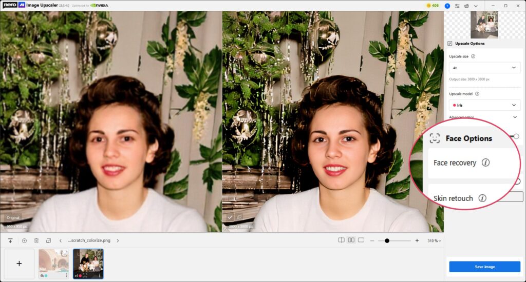 For those who frequently work with portraits and images containing faces, the new update introduces a dedicated Face Options section. This includes intelligent features like Face recovery and Skin retouch, designed to restore and enhance facial details with precision.